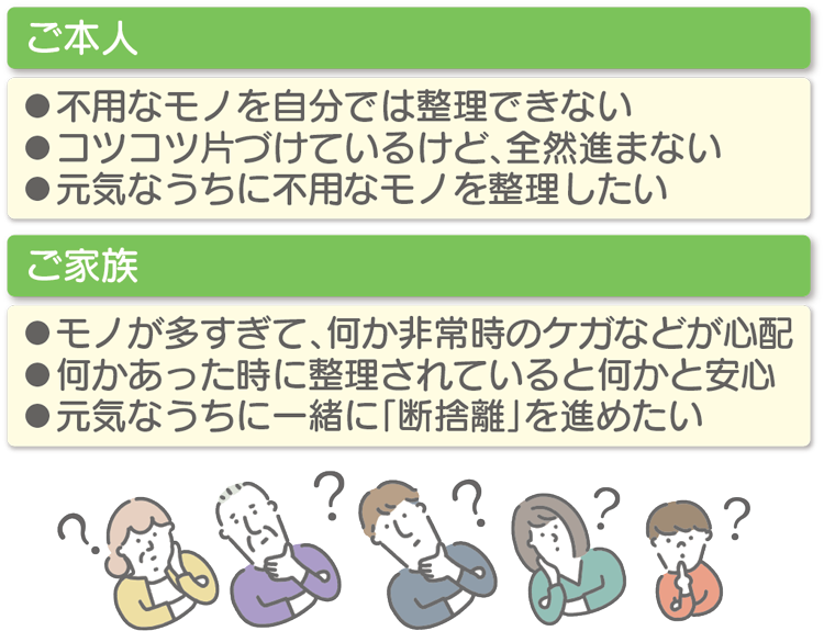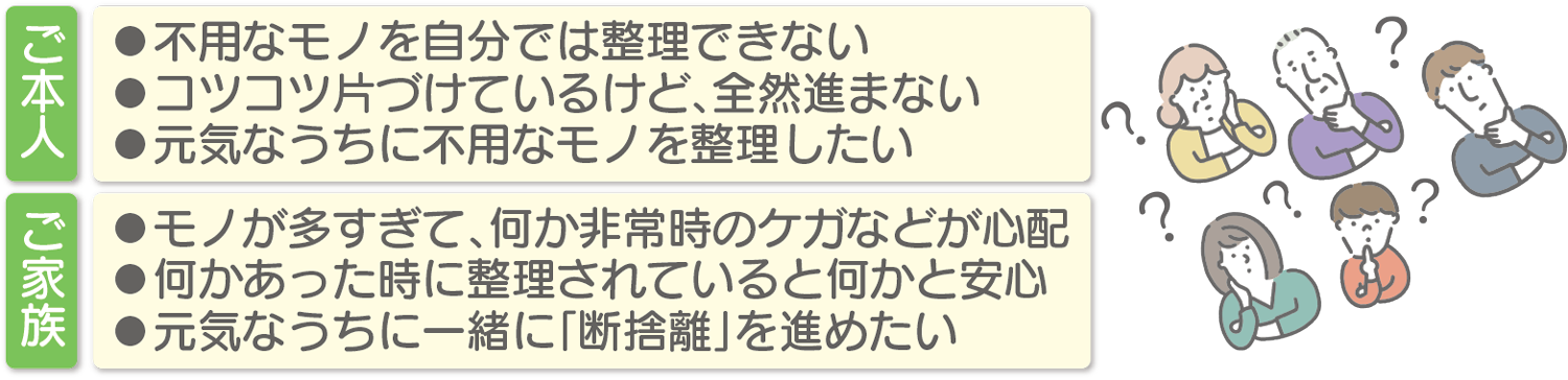 そして、不用なモノを整理することは非常時の安全へと繋がり、余計なモノの落下によるケガや火災の一因にもなり得ます。家族にとっては心配の要素のひとつでもあるのです。